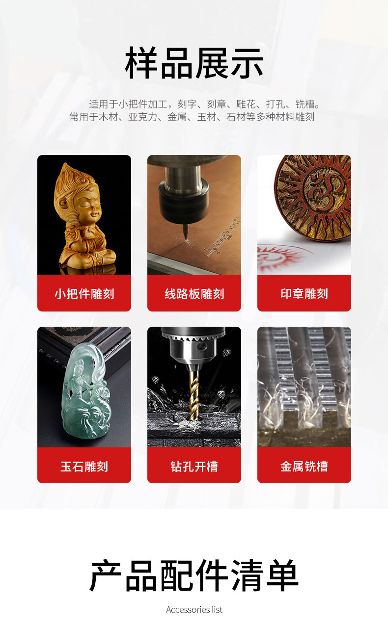 適合各類(lèi)木材、印章、亞克力、玉石、銅鋁金屬、模具加工,刻字雕花、人物山水。